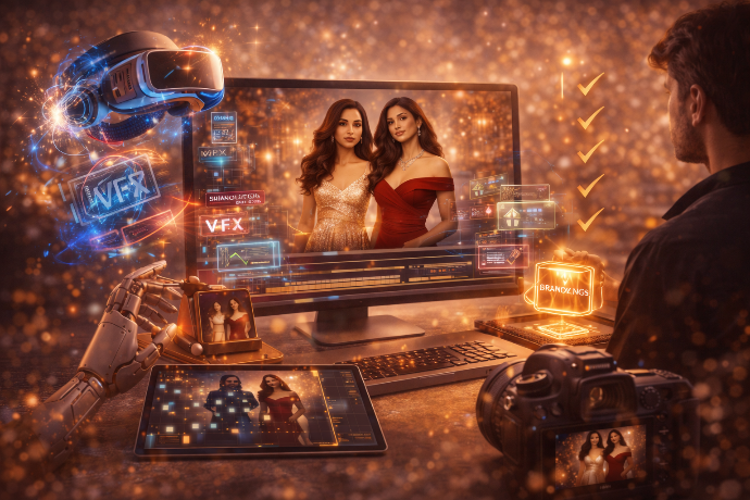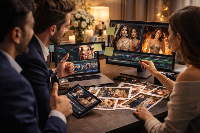 Sarees, lehngas, suits, couture designers — elegant cinematic invites.